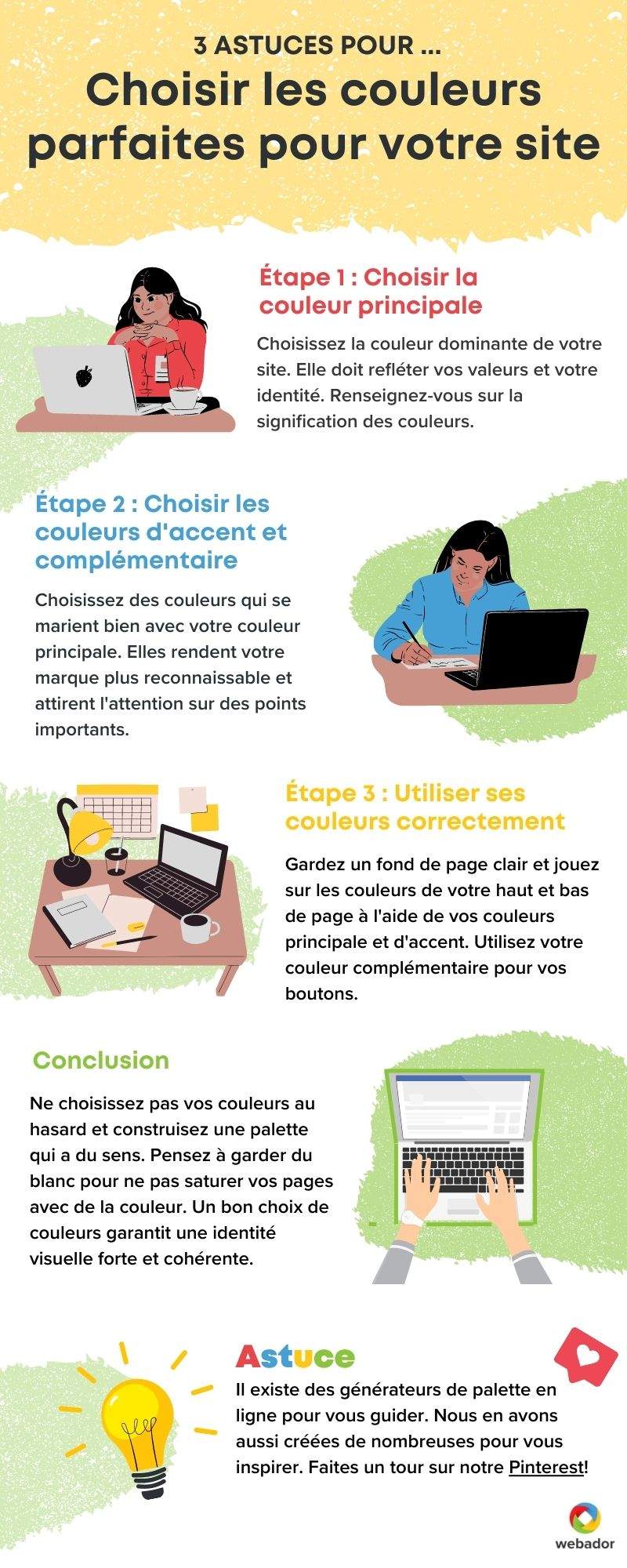 Pour choisir vos couleurs d’accent, vous pouvez opter pour des couleurs proches de couleur principale. Par exemple, si votre couleur principale est le vert, vos couleurs d’accent peuvent être un vert plus clair et un vert plus foncé.