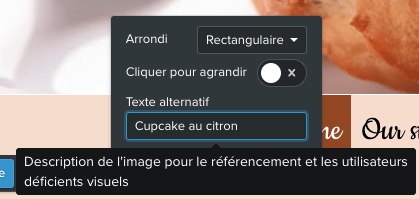 - Lorsque vous cliquez sur l’icône en forme d’engrenage dans la barre d’outils grise de l’élément, une fenêtre contextuelle apparaît et vous pouvez facilement ajouter le texte alternatif. Il s’agit d’une courte description de l’image. Ne rendez donc pas le texte alternatif trop long.